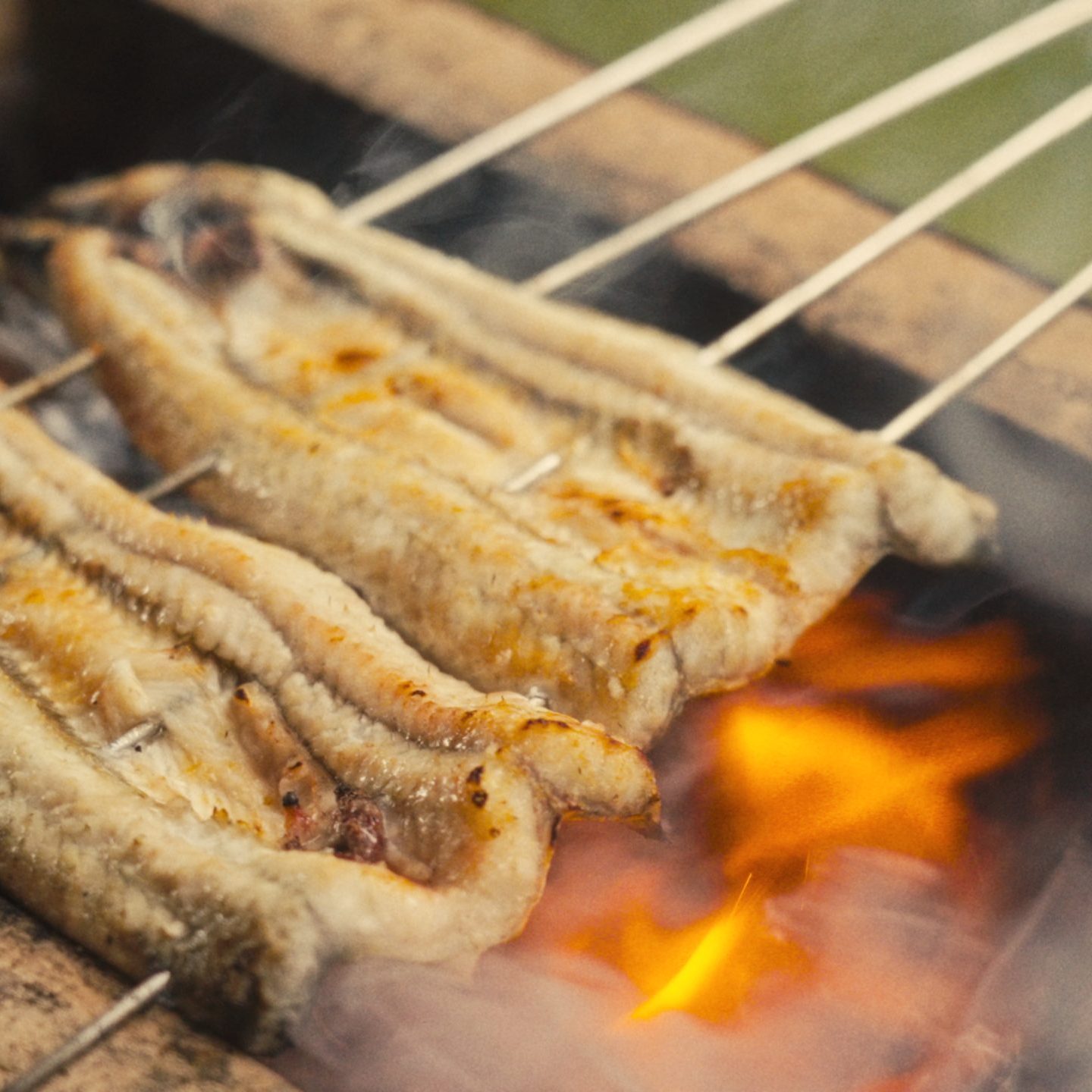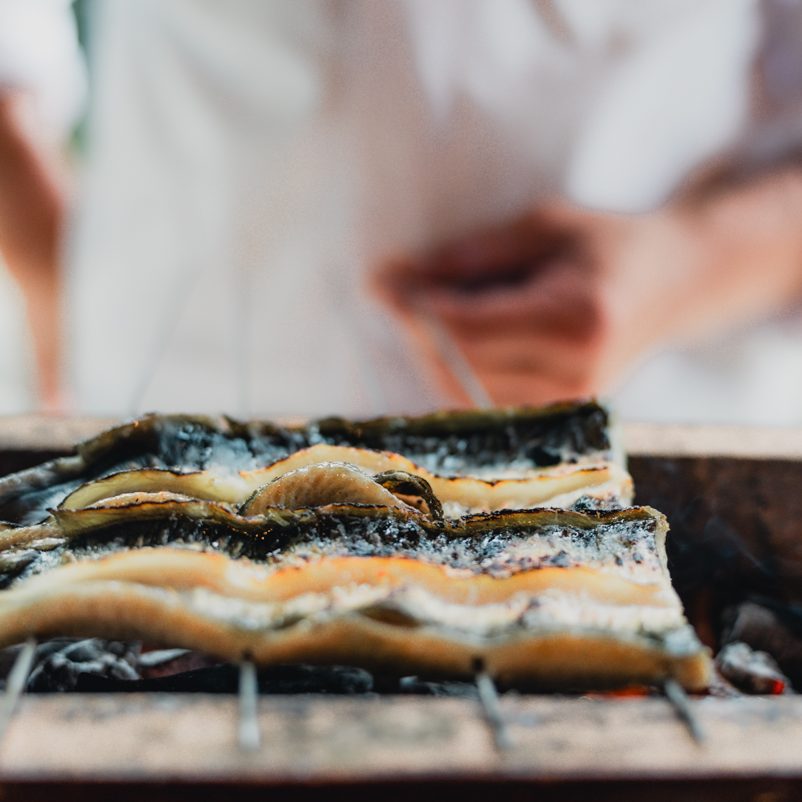 火の上で串を操り、鰻の身を折り重ねるように何度もたたく「こなし」と呼ばれる技法や、焦げやすい部分に水をかけながら焼き込む「みずかけ」、そして極限まで焼き入れすることで、うなぎ本来の旨みを逃さぬように丹念に火に入れていきます。表面に亀裂が入り脂が満遍なく周り、カリッとした香ばしさ、しっとりふっくら柔らかい口溶けをお楽しみください。